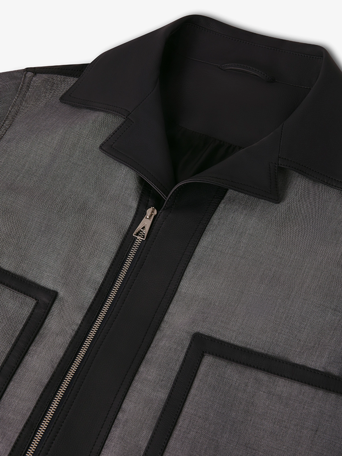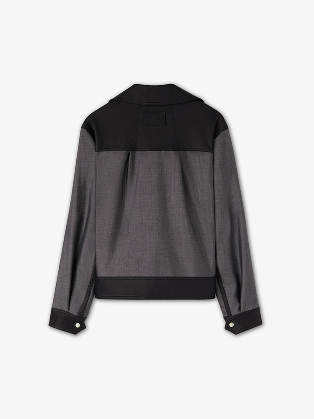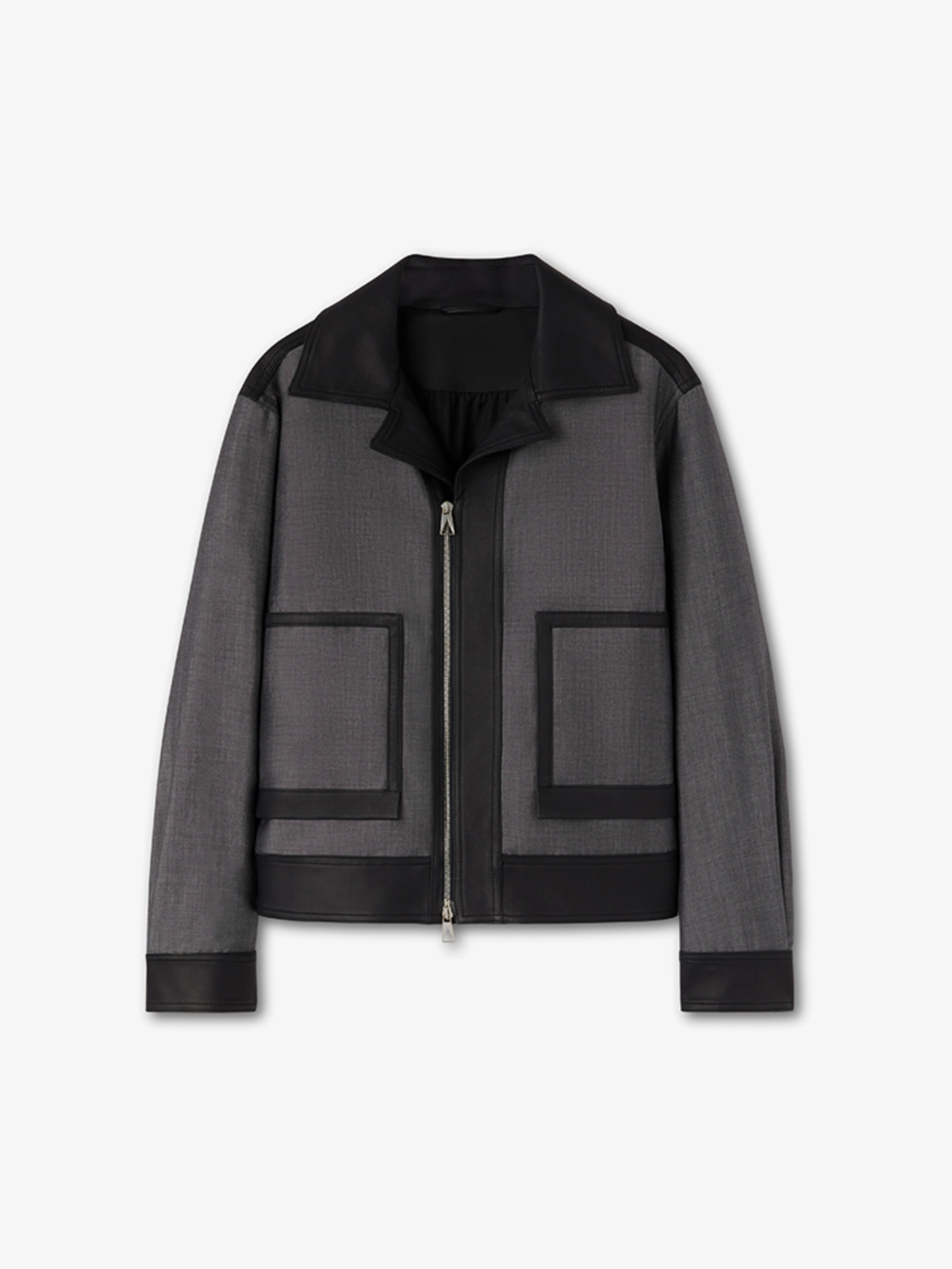 这款上衣采用小牛皮革制成,细节采用羊毛马海毛面料。它有衣领,前门襟,下摆和袖口,皮革和两个前贴袋