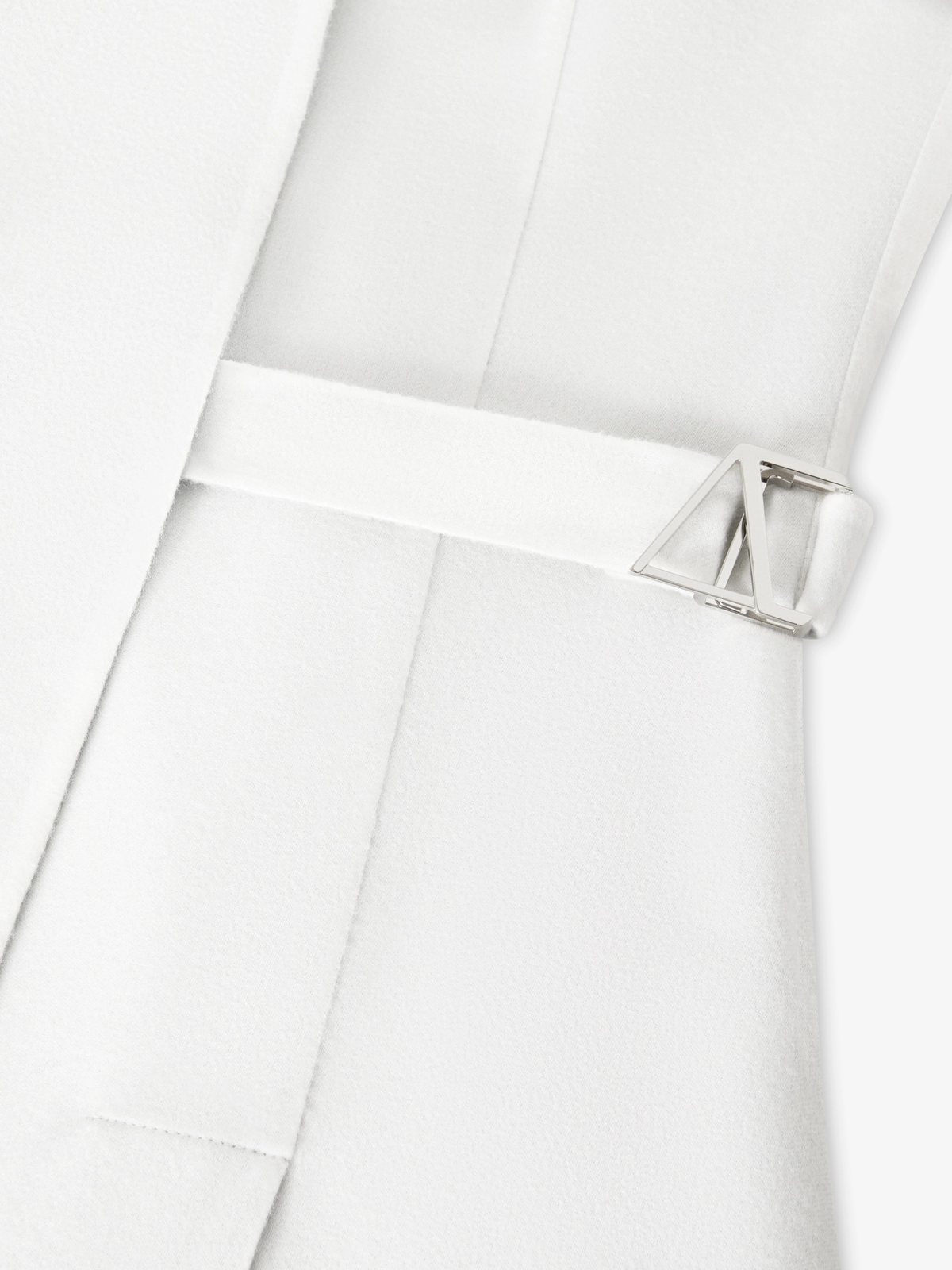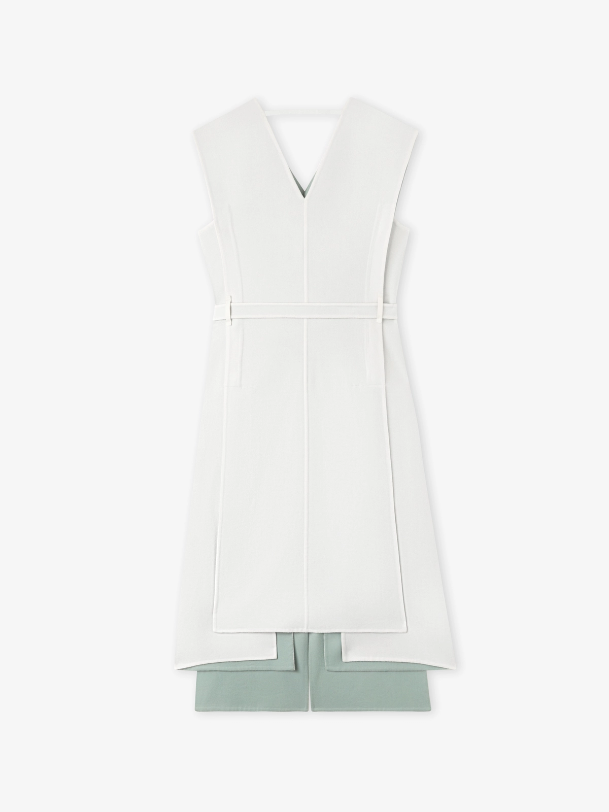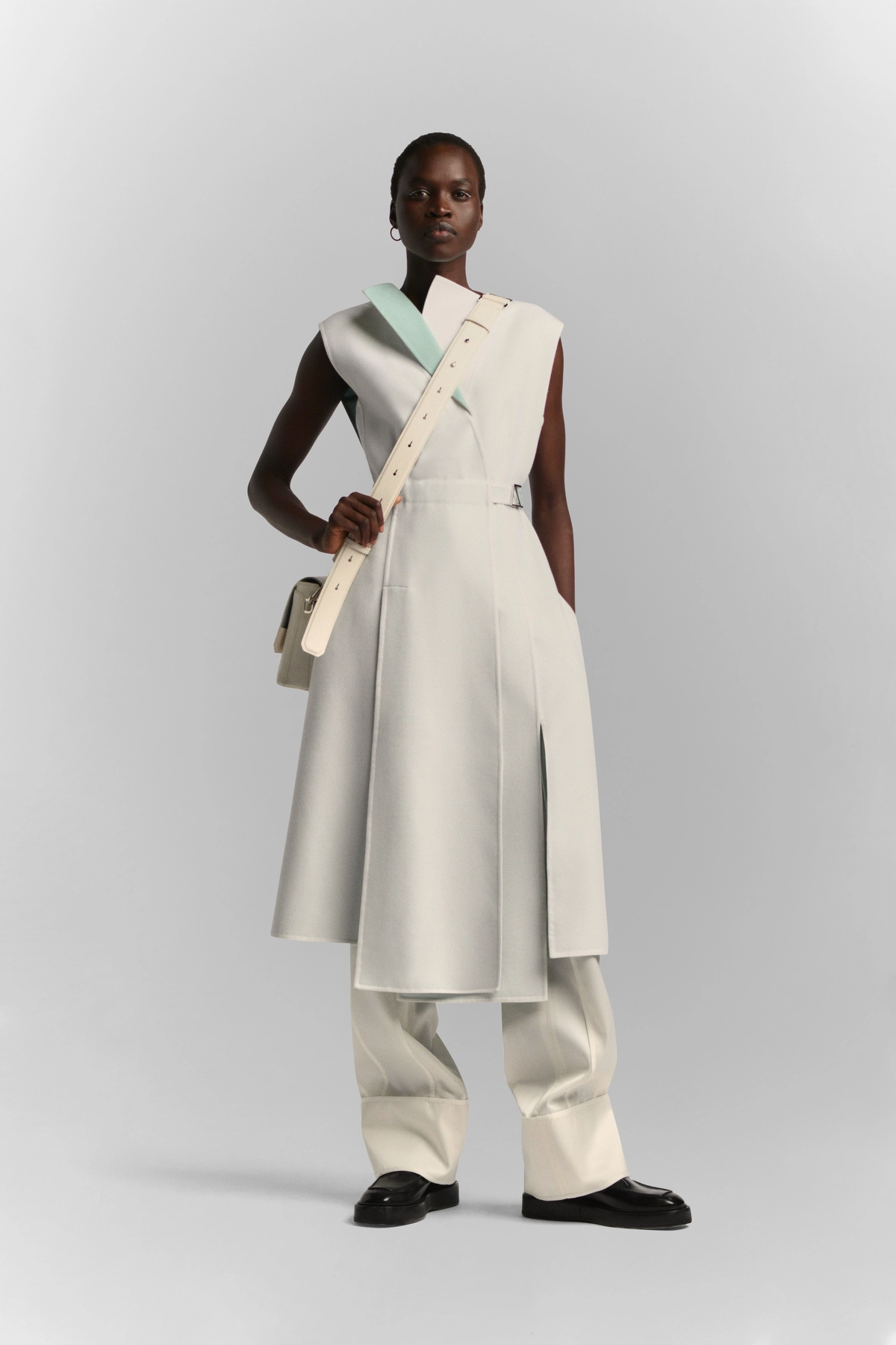 这件外套由美利奴双面羊毛面料制成,通过重叠拼接呈现出女性化设计,并配以 ANEST Logo 客制化可拆卸金属扣皮带。