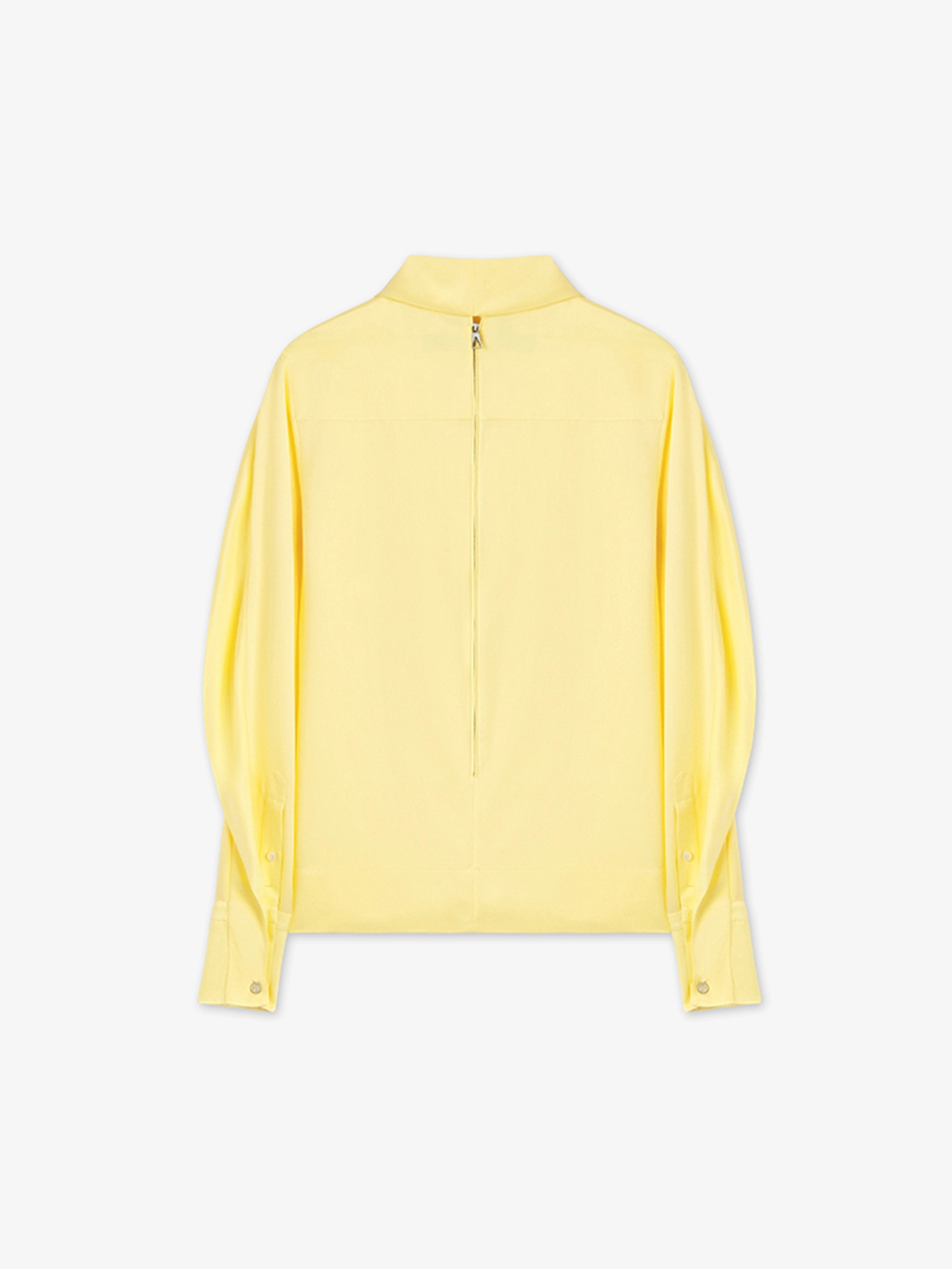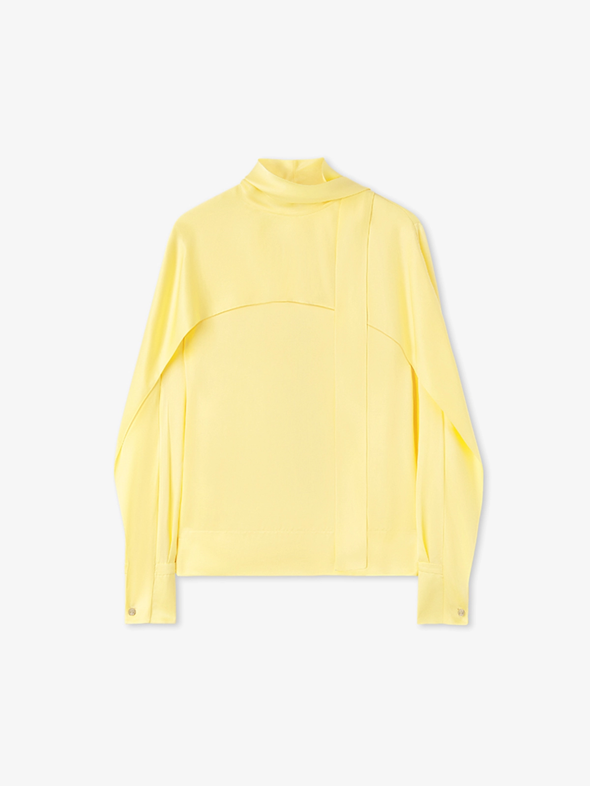 这件衬衫是由流动的桑蚕丝混纺面料制成的;它有一个折叠的正面,带有大片围巾式的设计细节和背面拉链封口