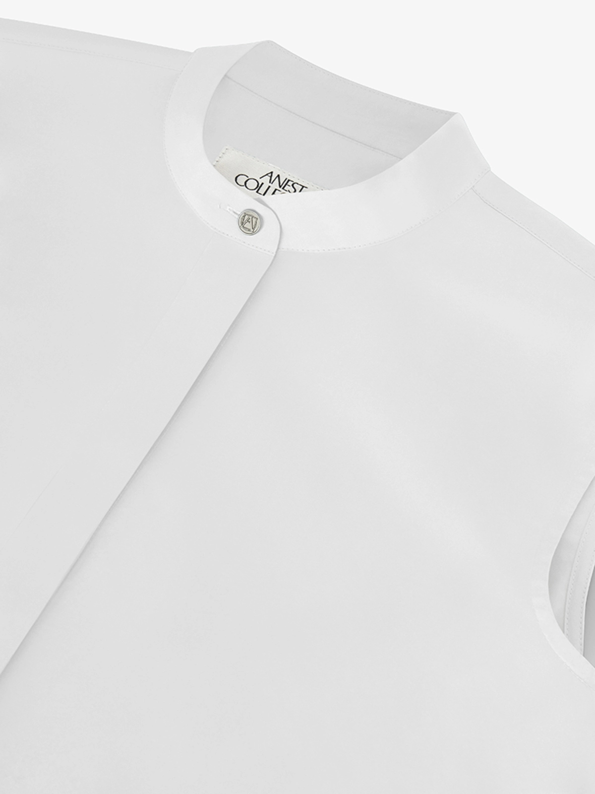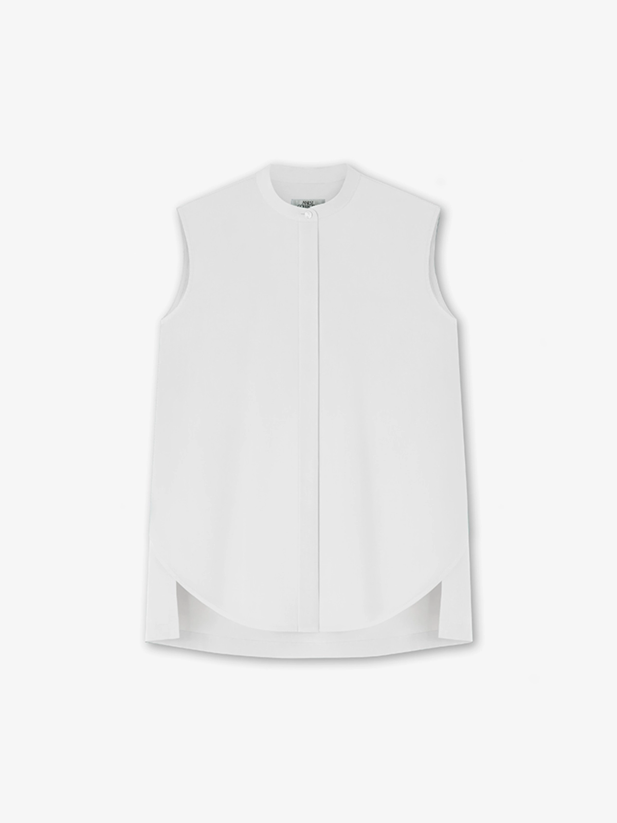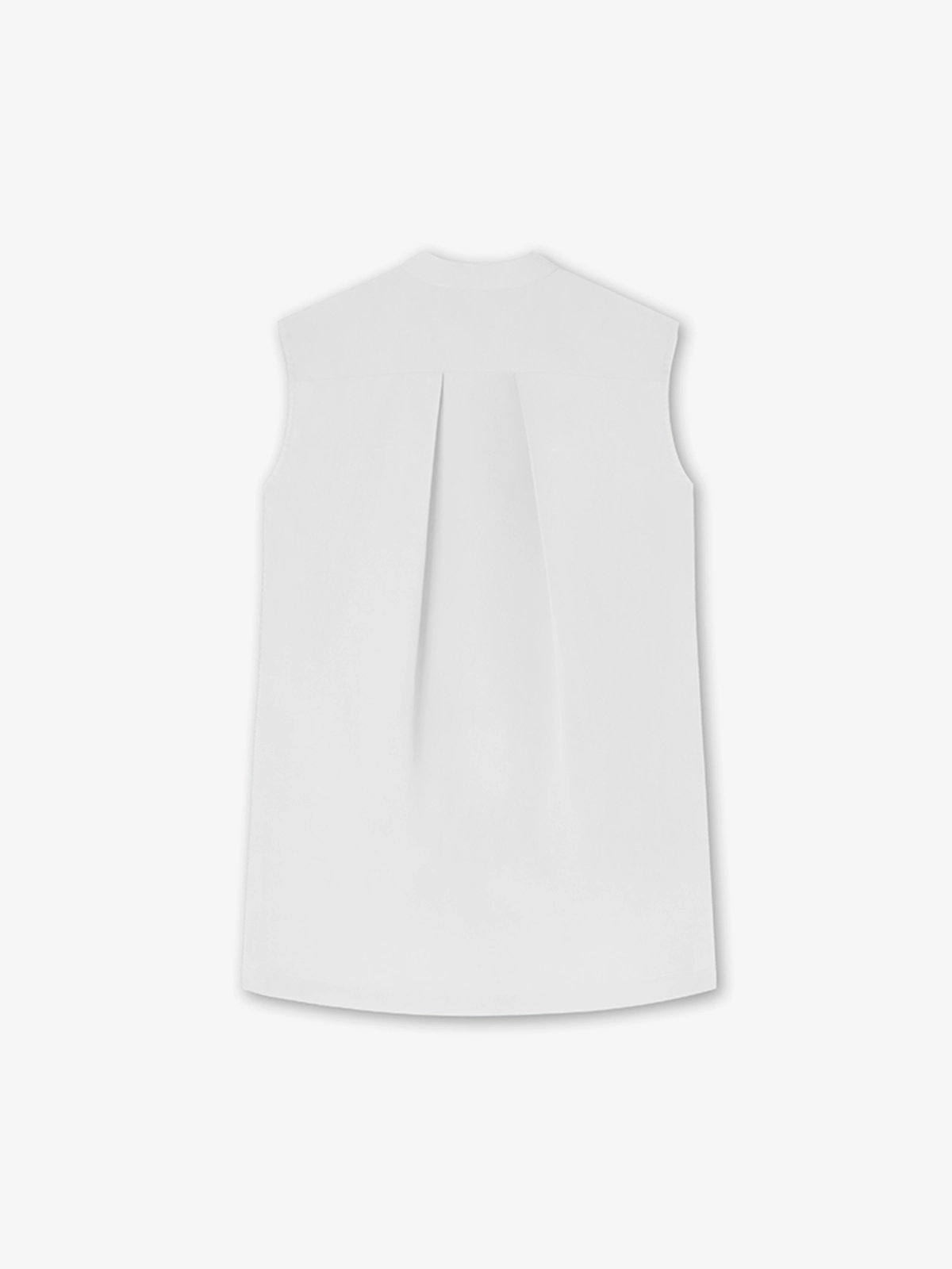 这件无袖衬衫是由纯棉府绸剪裁而成,并在背部饰有一个“A”型剪裁细节。