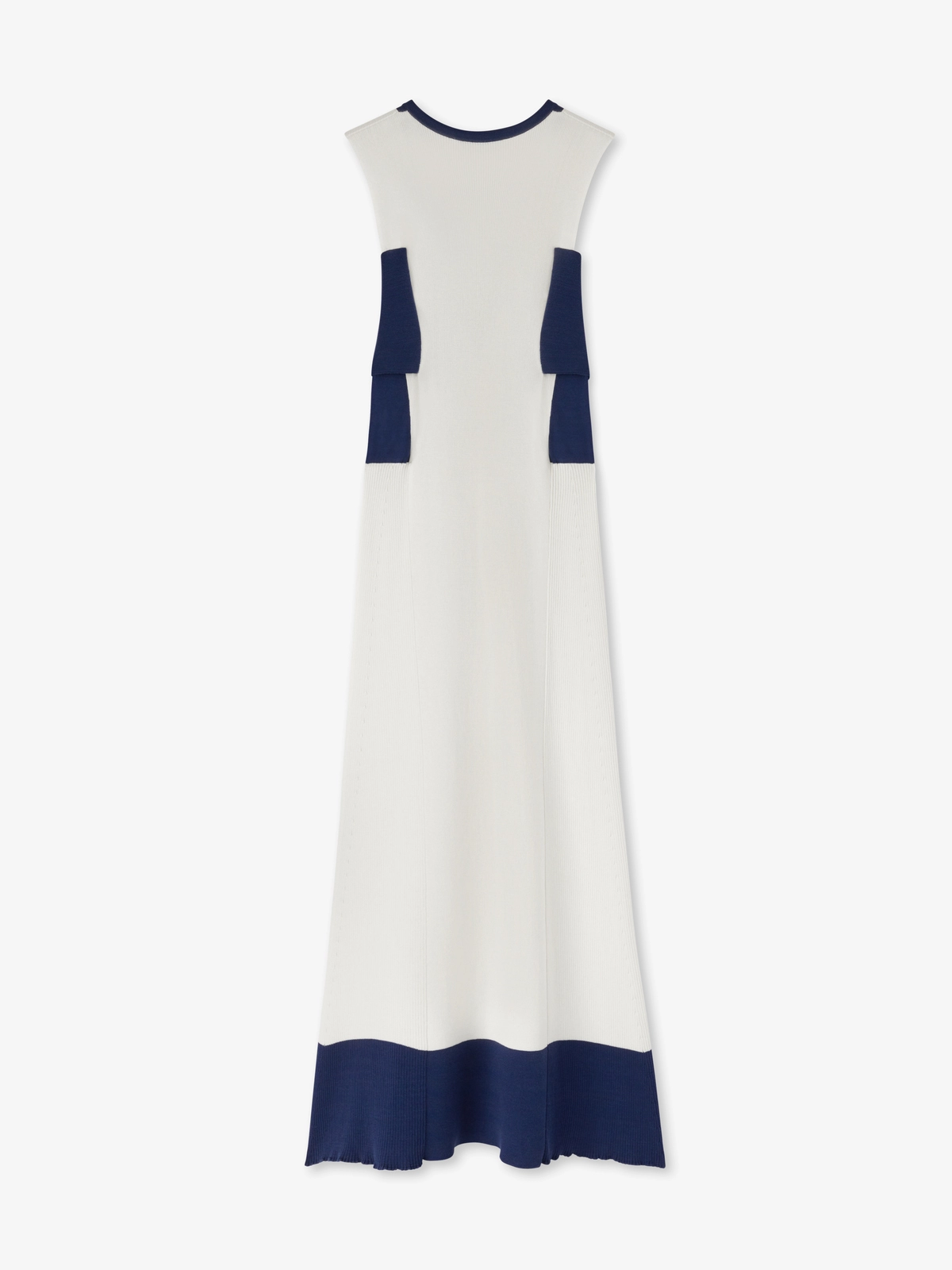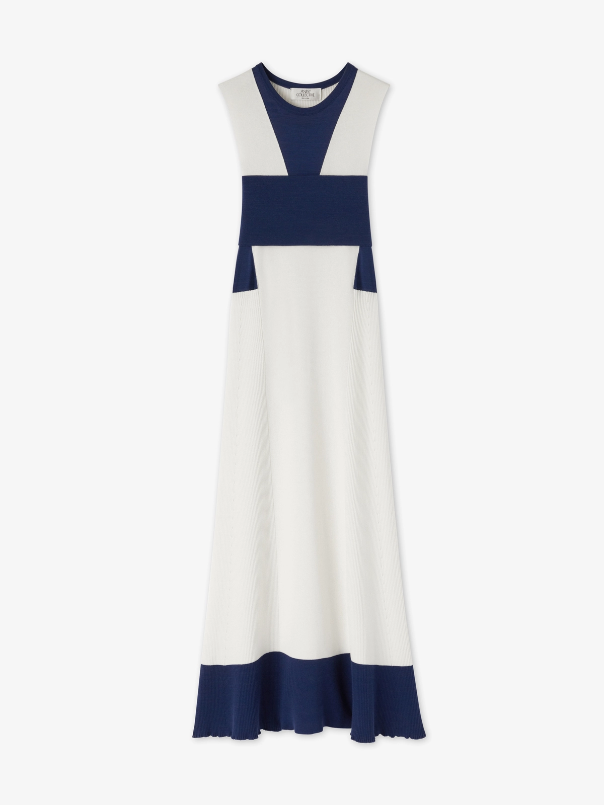 这件长针织连衣裙是由棉桑蚕丝混纺制成,并混合了缝合技术。