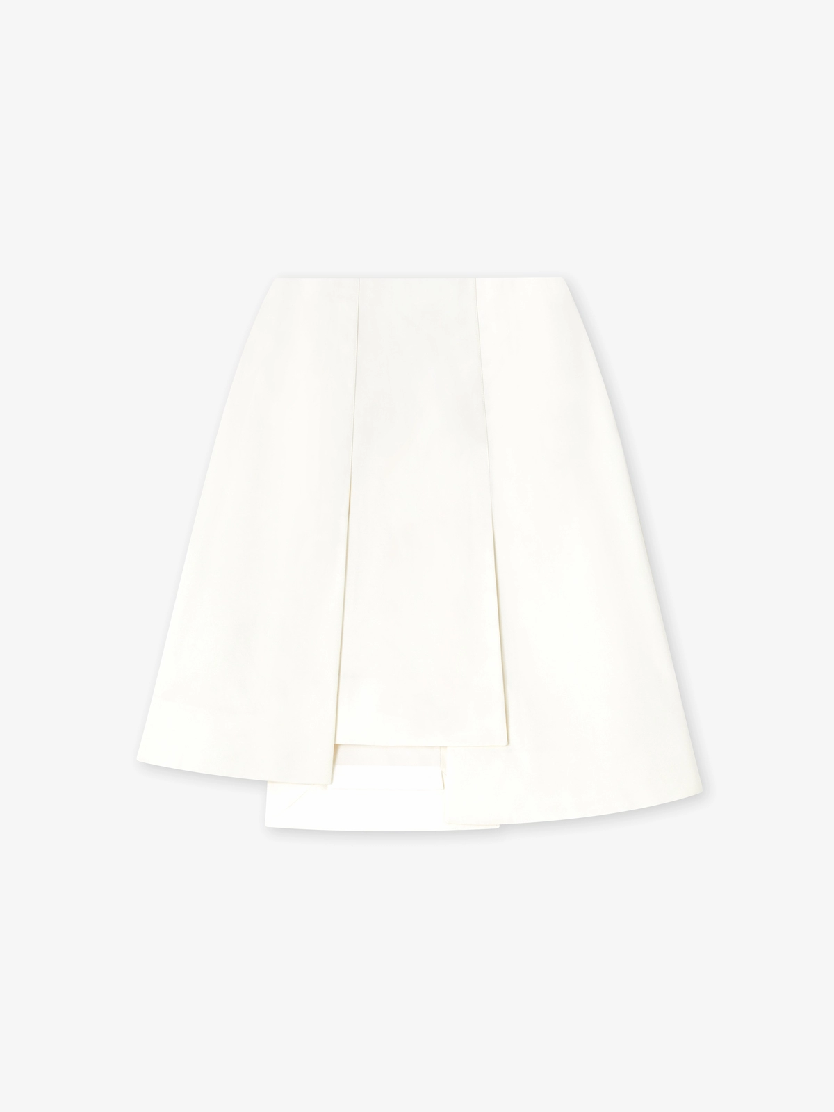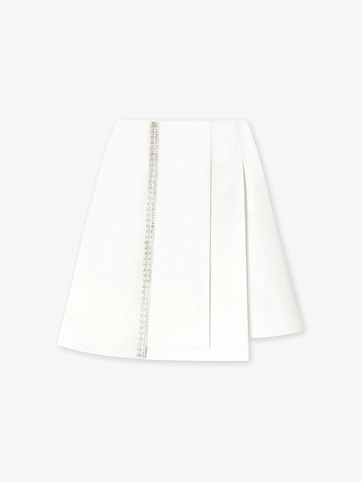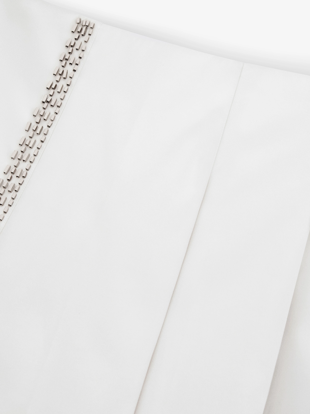 这款多层次及膝裙由羊毛桑蚕丝缎面定制面料制成,前幅饰有银色金属刺绣。