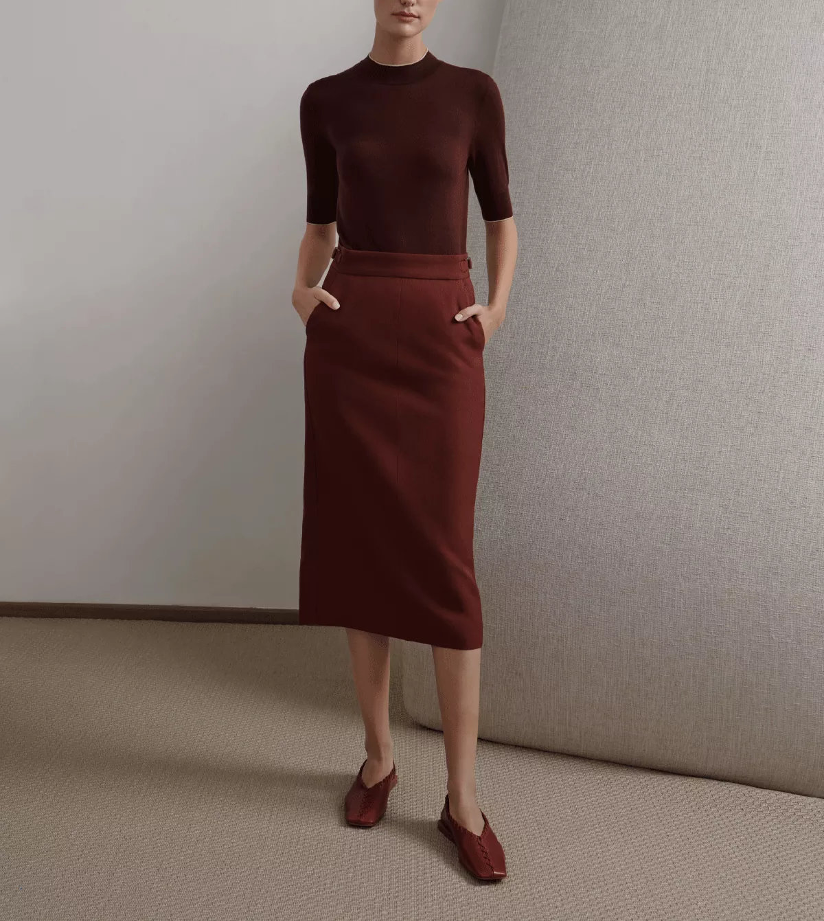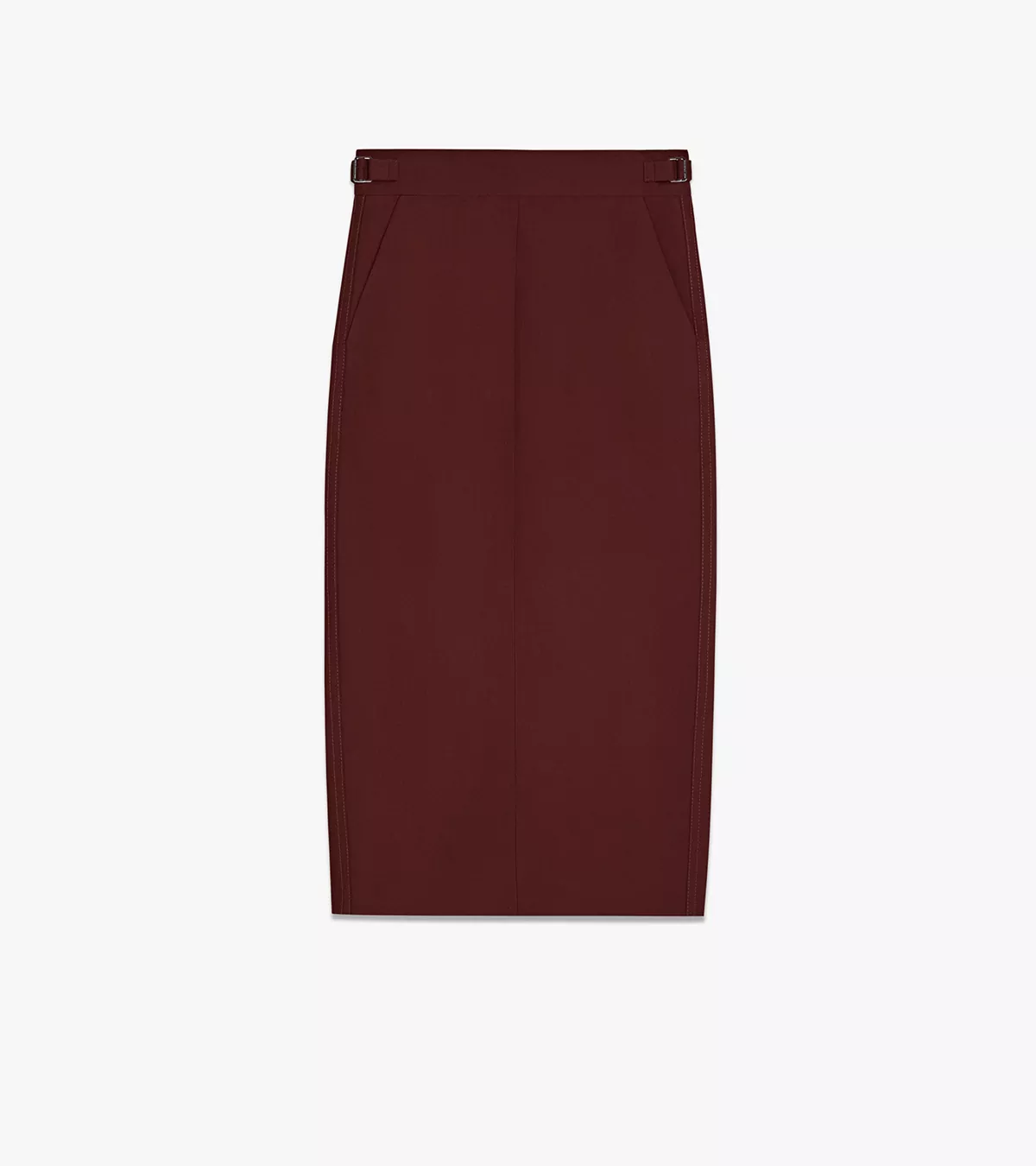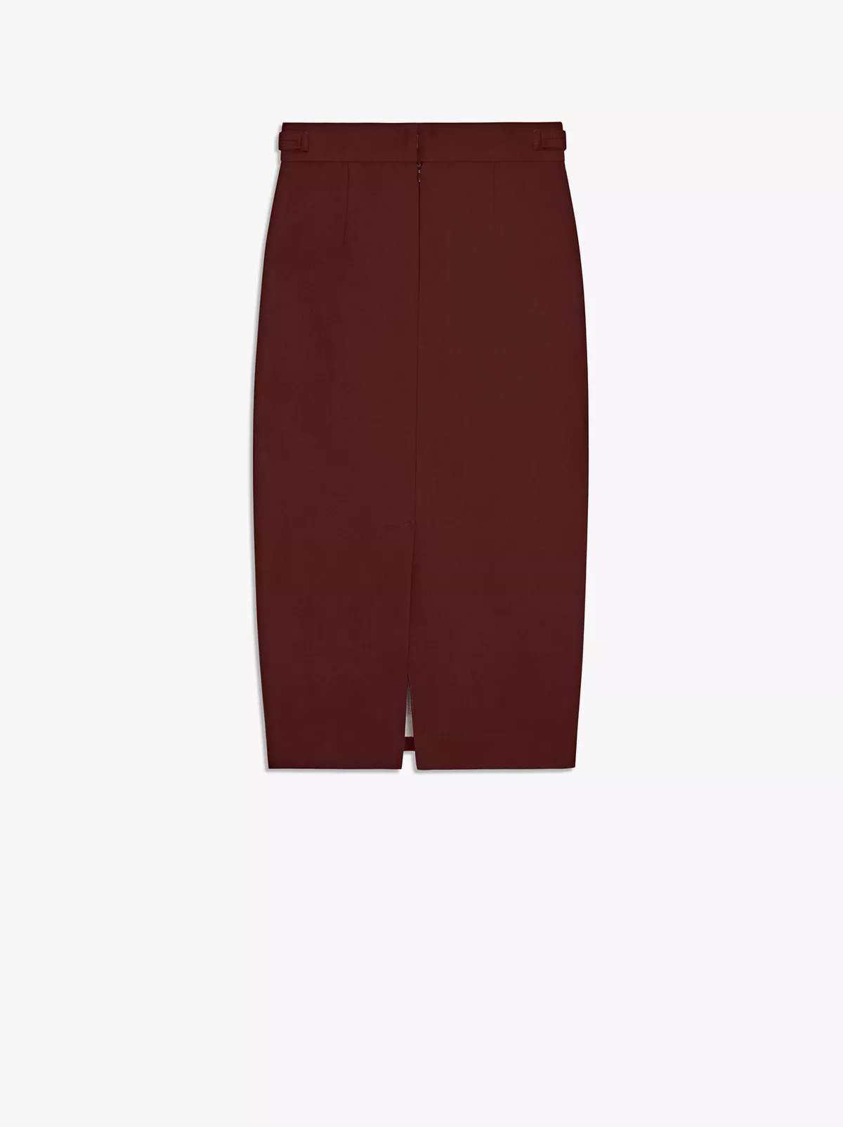 - 赭红色 - 后中缝线开衩铅笔裙- 双侧斜边装饰线;侧调节腰袢 - 意大利150织精纺羊毛- 100%羊毛- 意大利制造