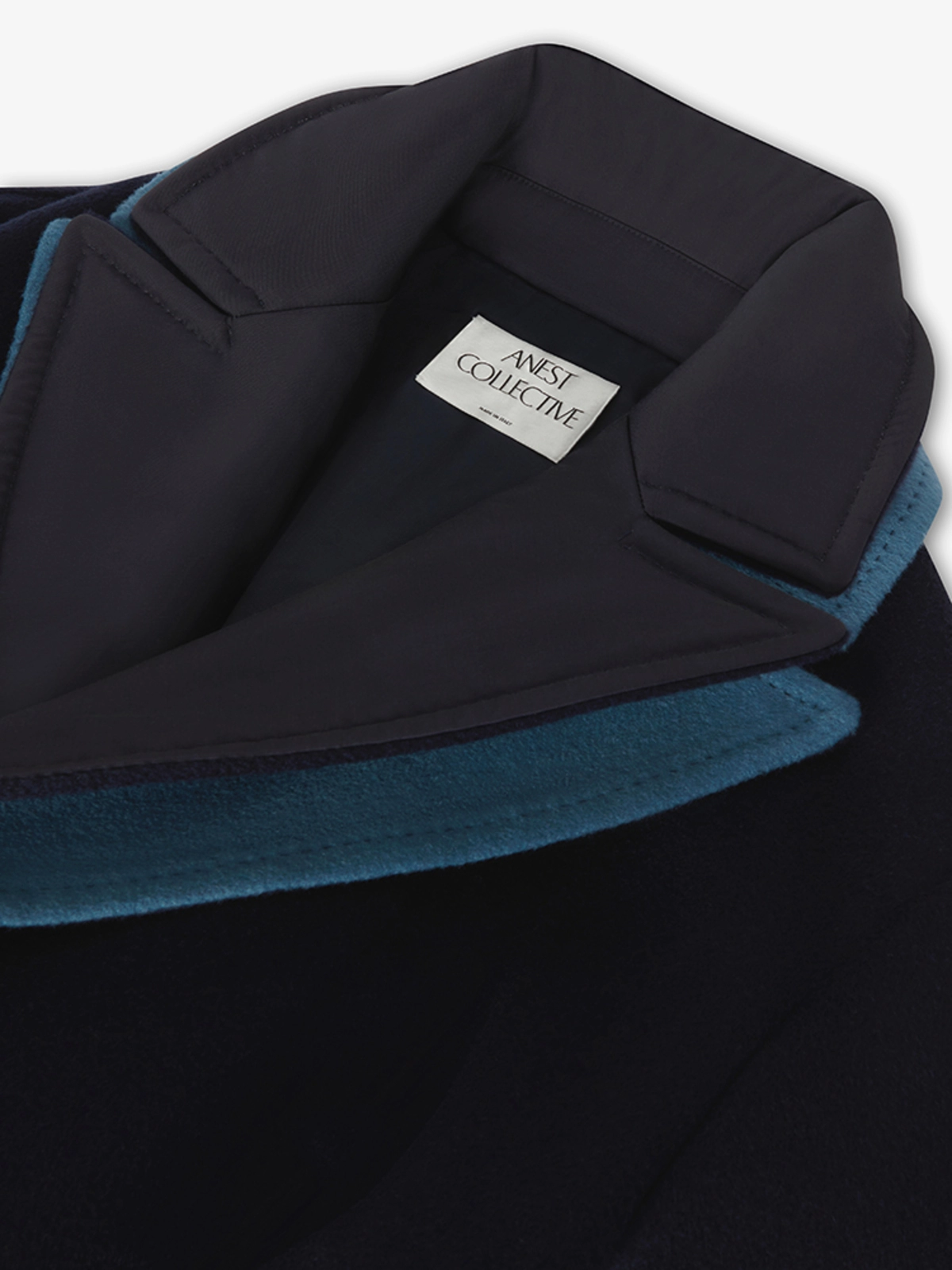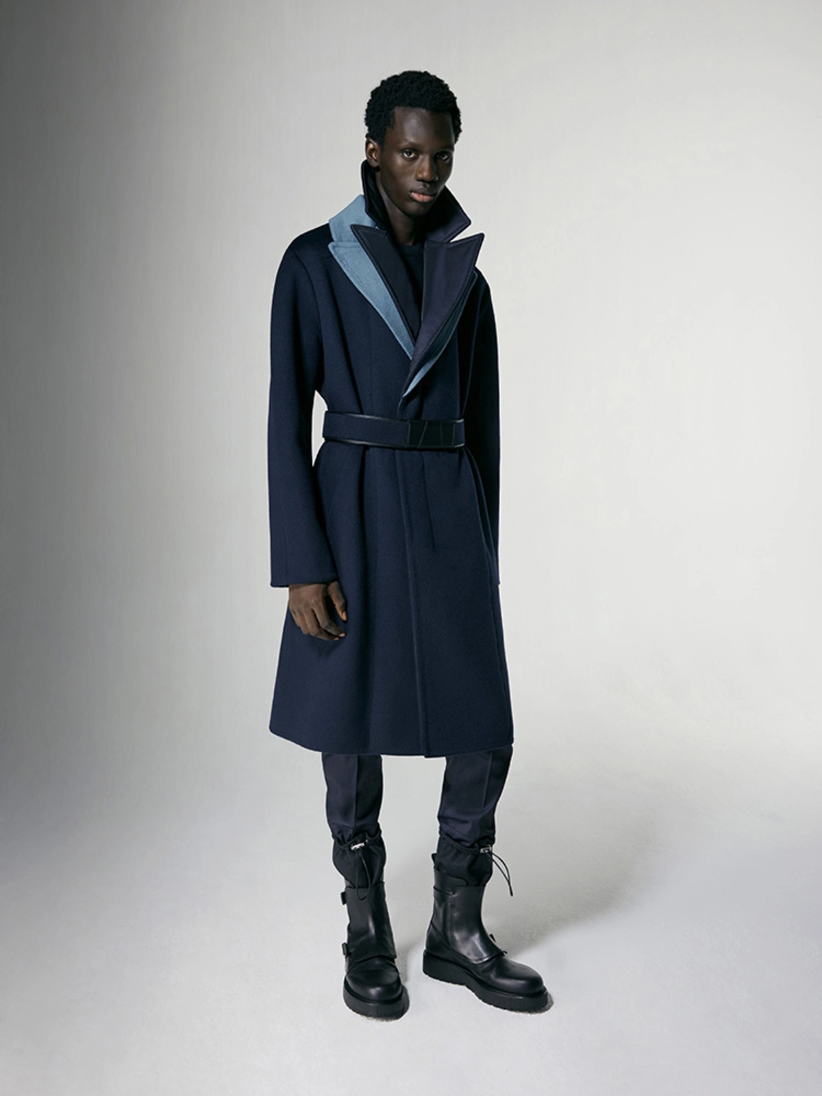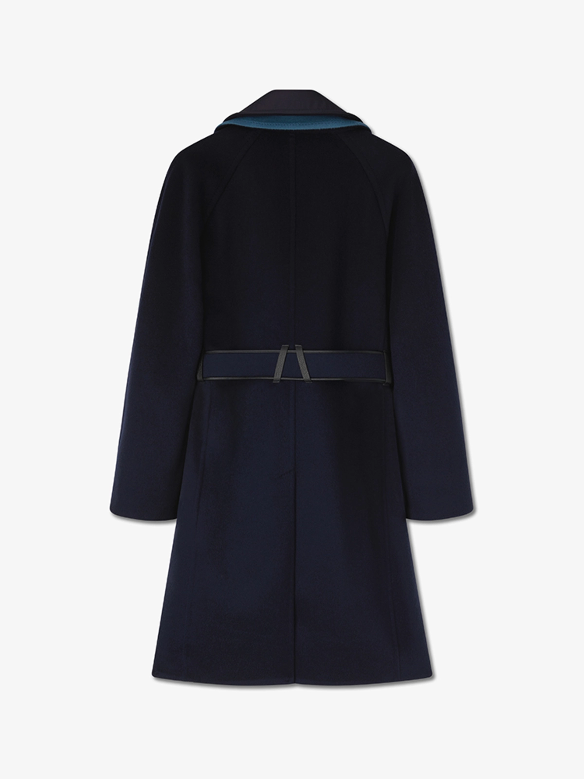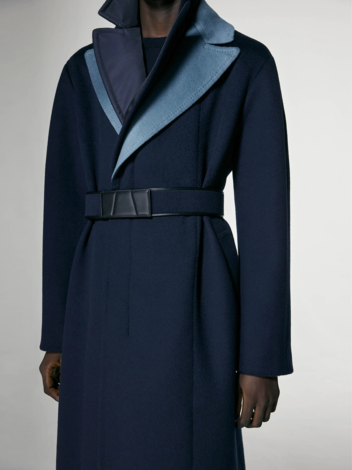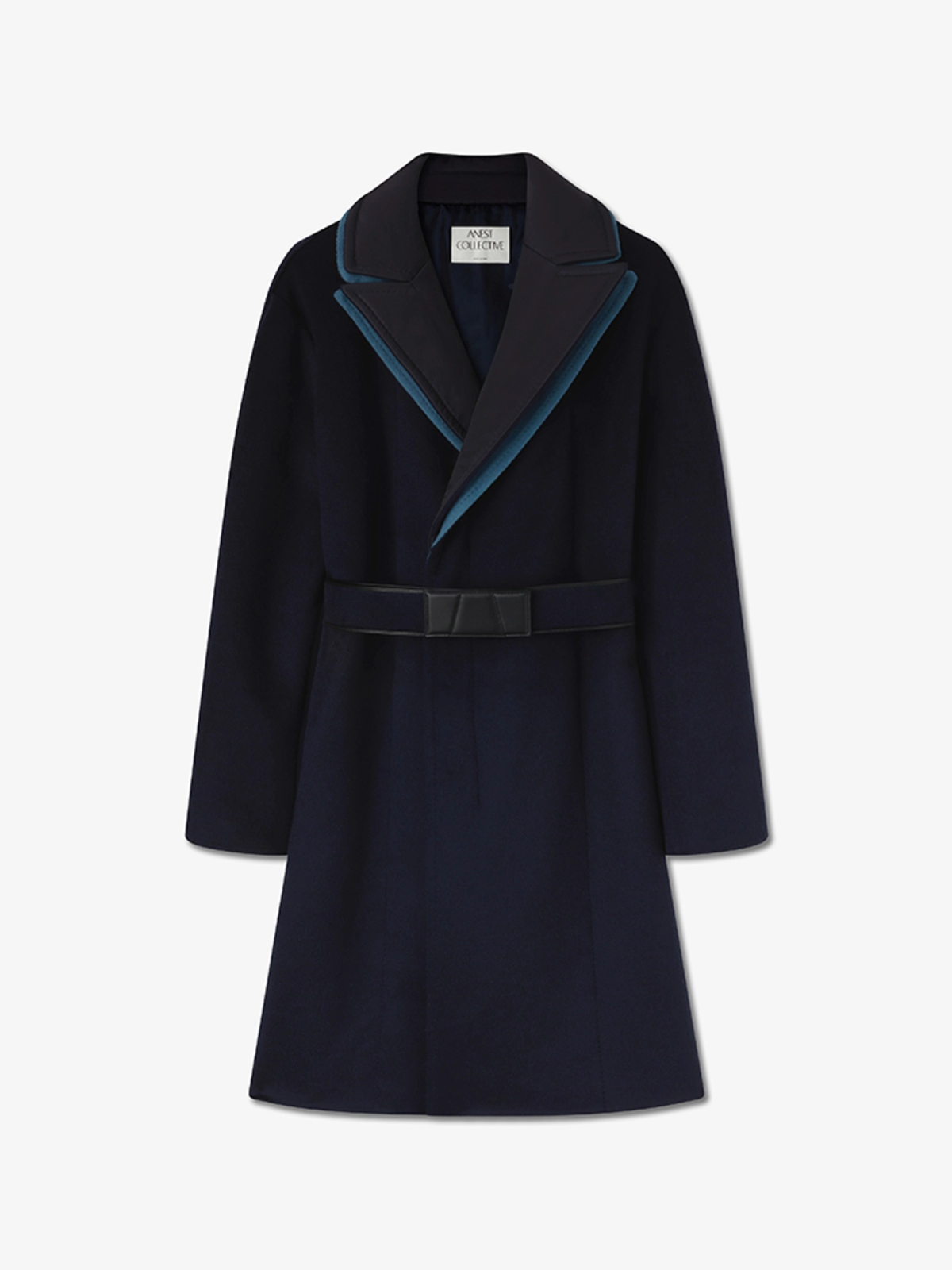 这款双排扣的双面羊毛羊绒混纺大衣,带有对比色的双层领口。它使用隐藏的牛角钮扣和一根带有 ANEST 标志性 A Logo的皮革扣的羊绒腰带来扣合。