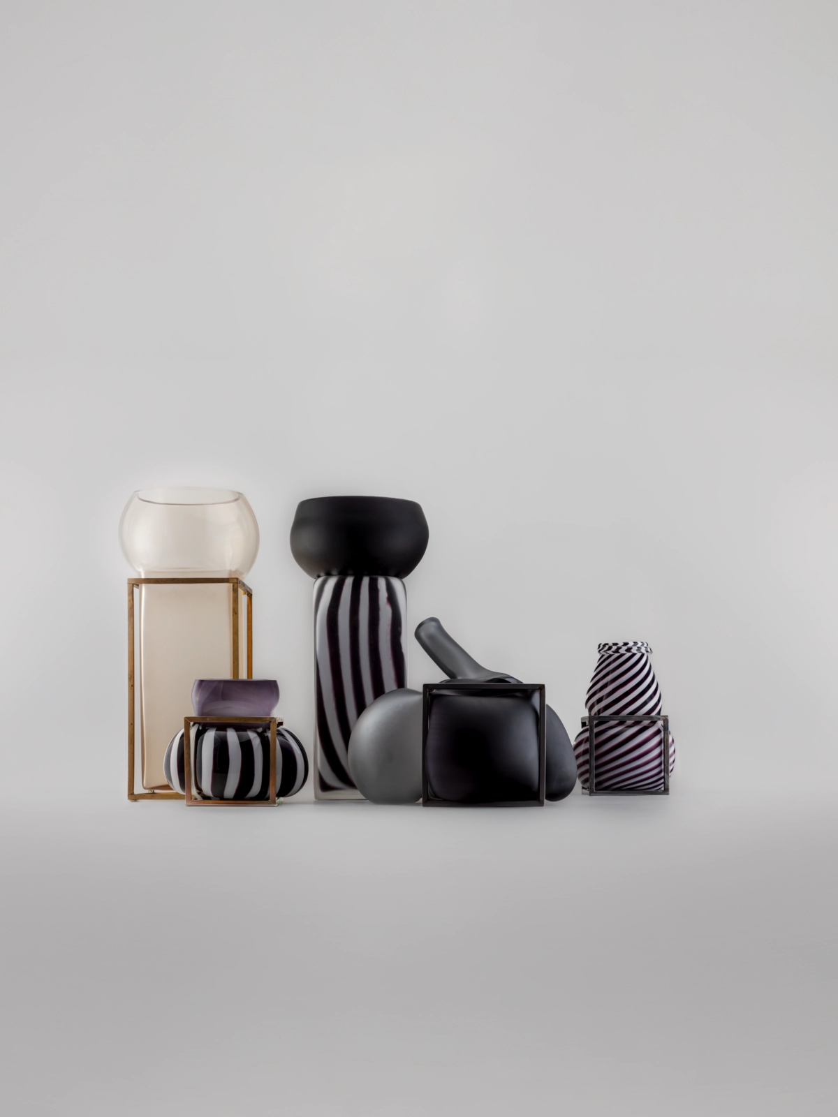 - 花瓶灵感源于威尼斯传统灯笼(lampare lanterns),每件作品都独一无二,均采用双层吹制工艺,由多位工匠协作完成。玻璃被吹制进金属框架中,与青铜或铁巧妙融合,历经四天的精密冷却过程以防止裂纹,确保每一件作品的完美无瑕。