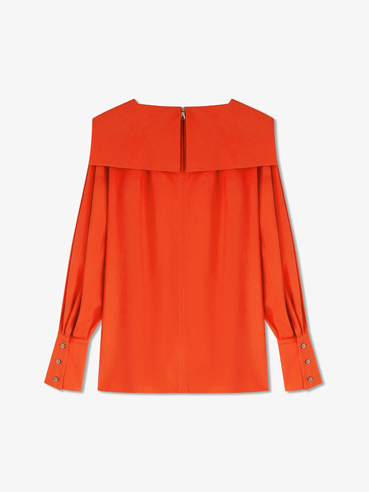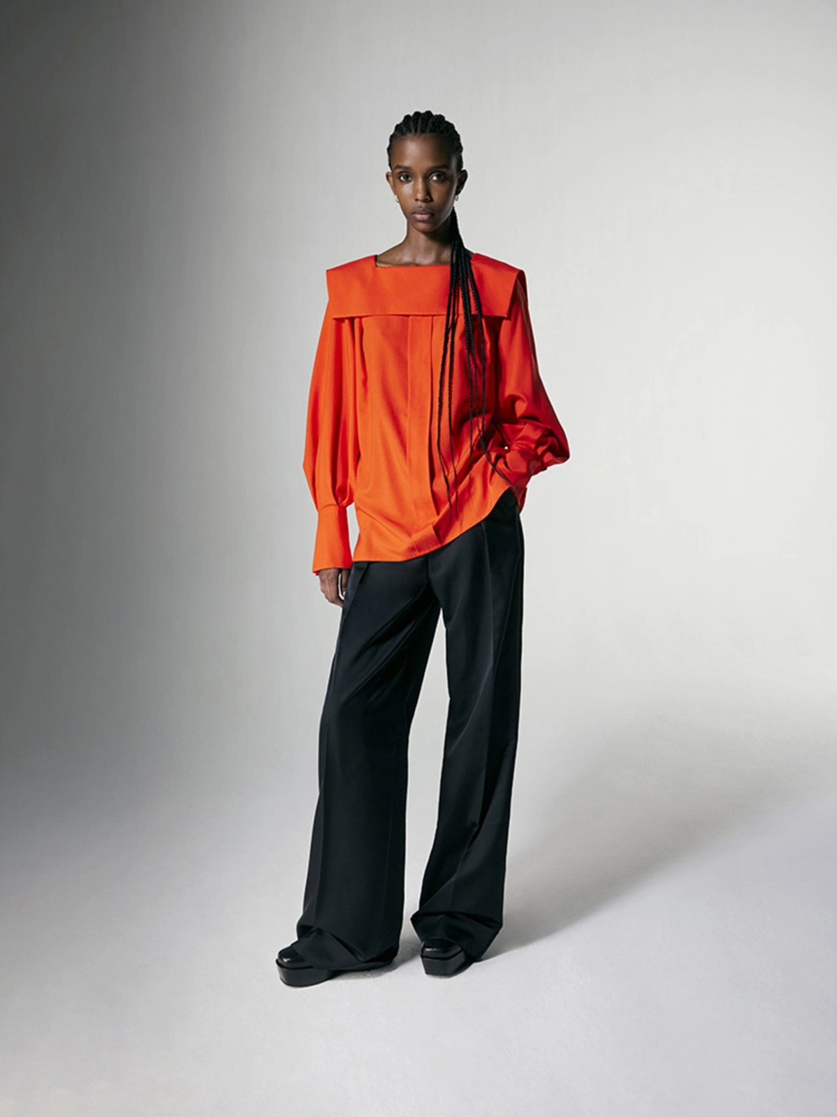 这款长袖桑蚕丝衬衫,带有水手领和超大袖口,和 ANEST 标志性 A Logo 金属钮扣设计细节。它使用后部拉链拉合,拉链上也带有 ANEST 标志性 A Logo 拉环。