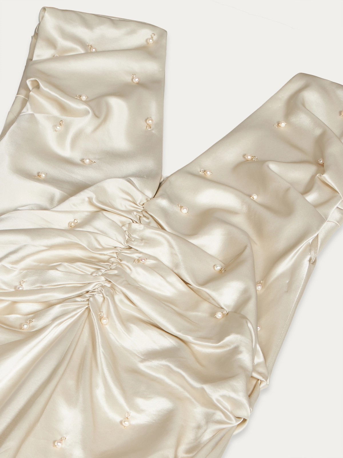 礼服选用光滑柔软的丝缎混纺面料,经过匠心独运的手工处理,面料如流水般被揉捏出雕塑般的褶皱,每一个褶皱都仿佛在诉说着时间与自然的故事。礼服最终被珍珠点缀,宛如夜空中的星辰,赋予每一件作品无与伦比的光芒与灵魂。