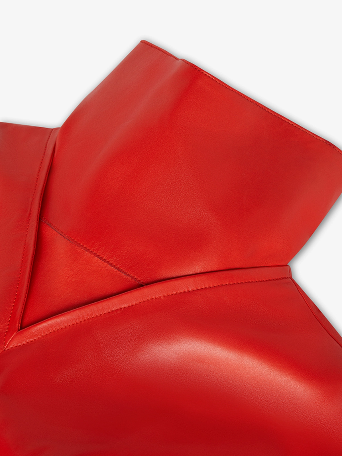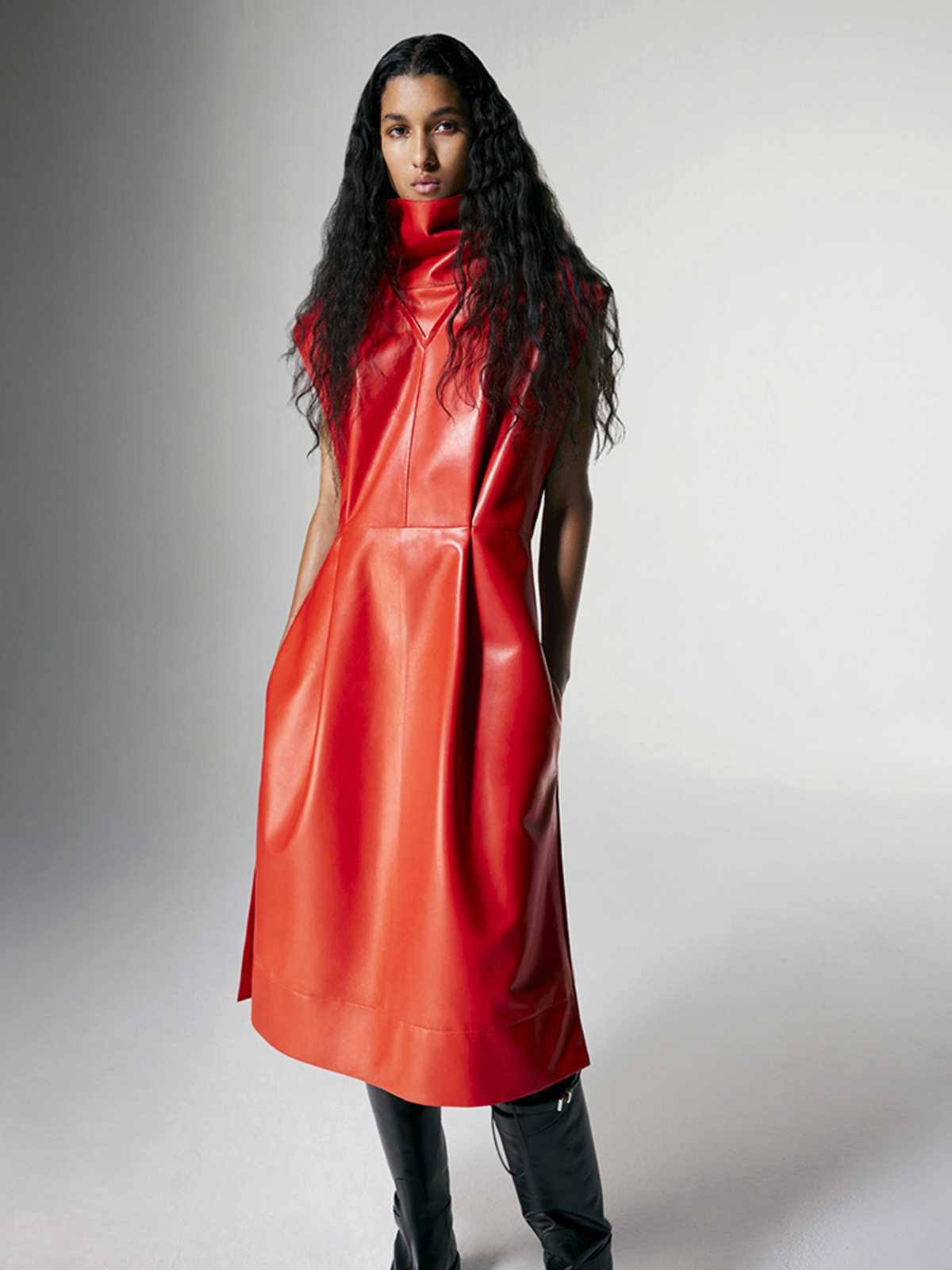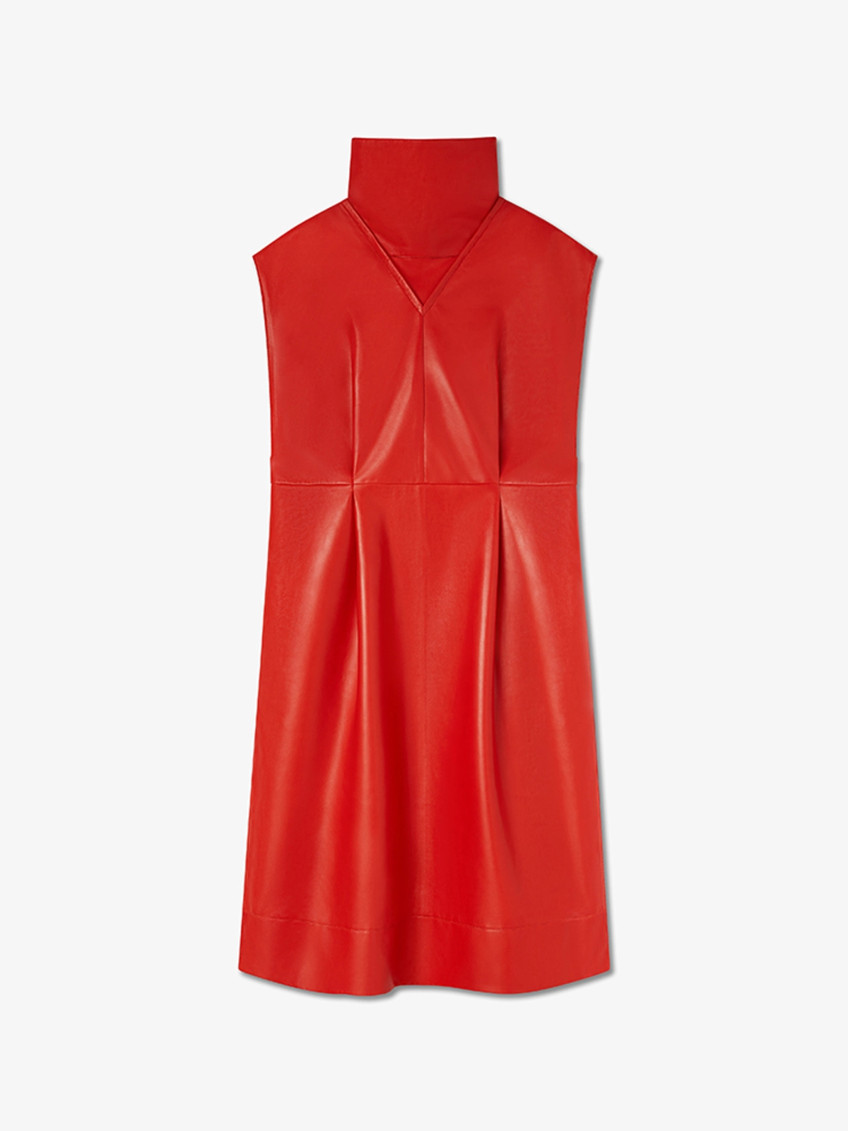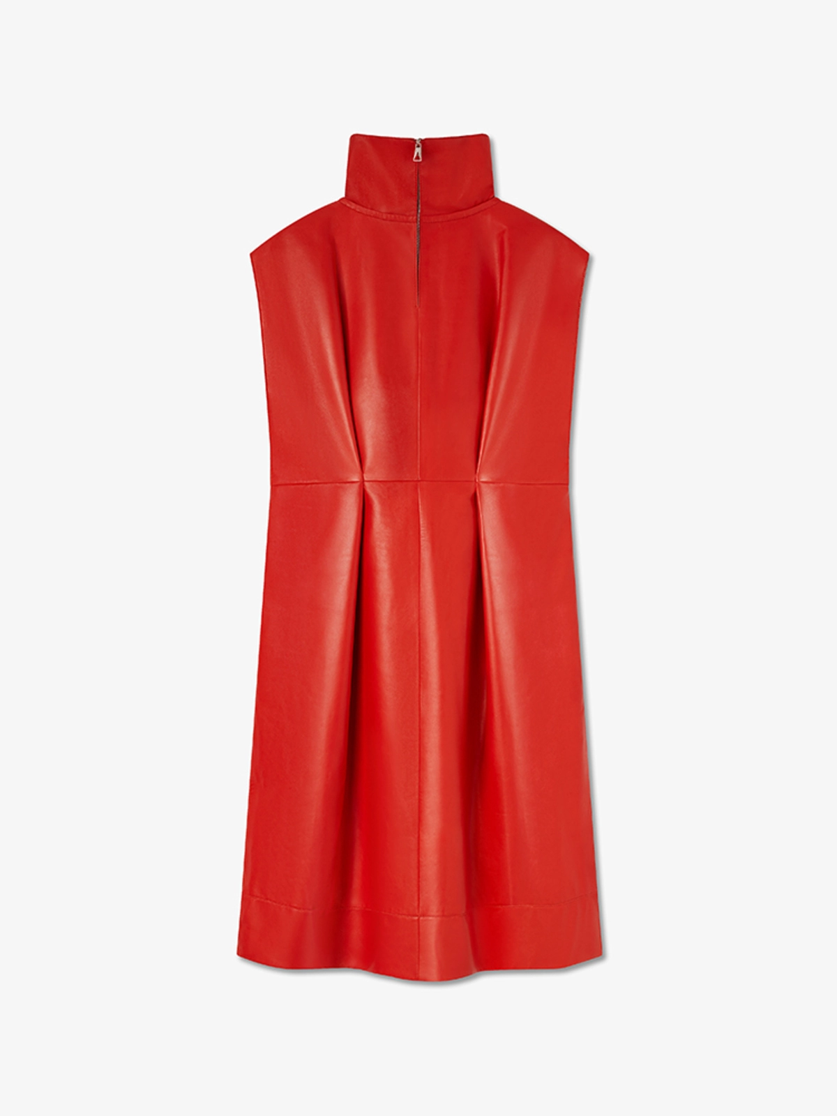 这款无袖的小牛皮连身裙,具有双层领口、背部褶皱、两侧缝袋和侧面开叉设计。背部使用拉链拉合,拉链上带有 ANEST 标志性 A Logo.