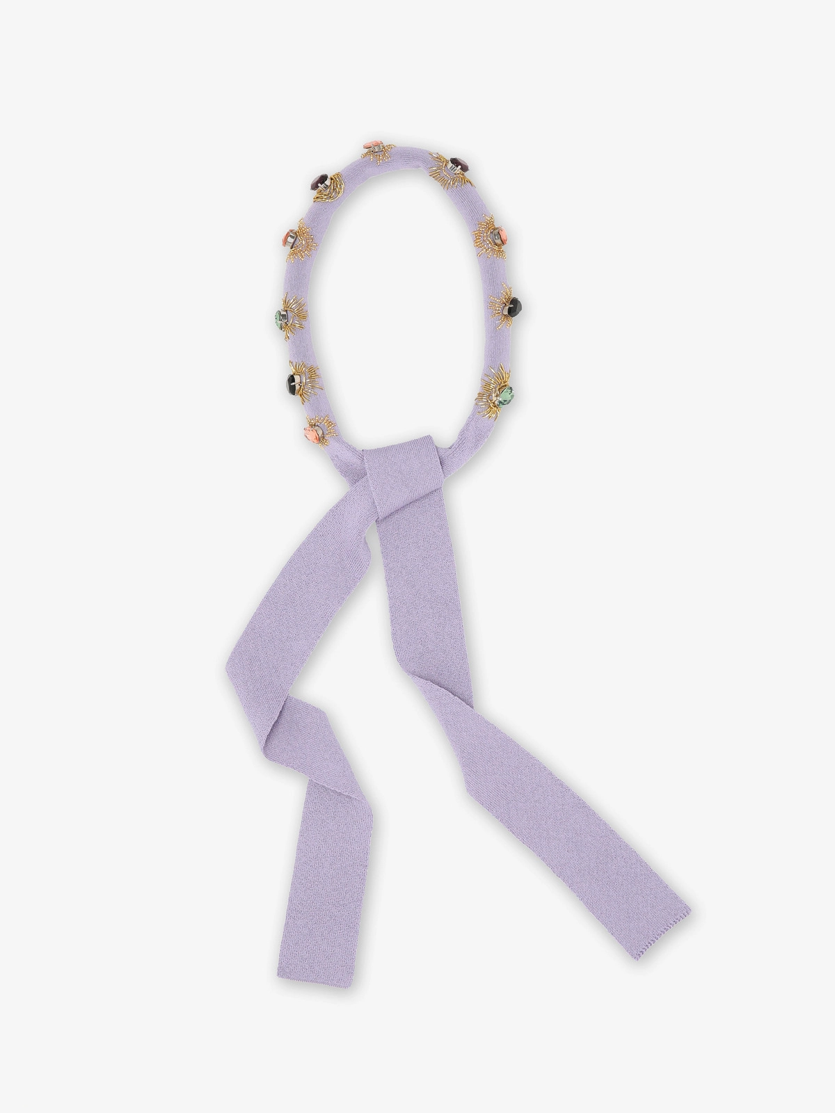 这款针织项圈采用柔软的棉与粘胶纤维混纺纱线精心织就,触感顺滑轻盈,自带柔和光泽。 作为彰显个性的配饰单品,精心镶嵌着手工刺绣的宝石状装饰,为整体造型增添一抹优雅华彩与灵动光芒。