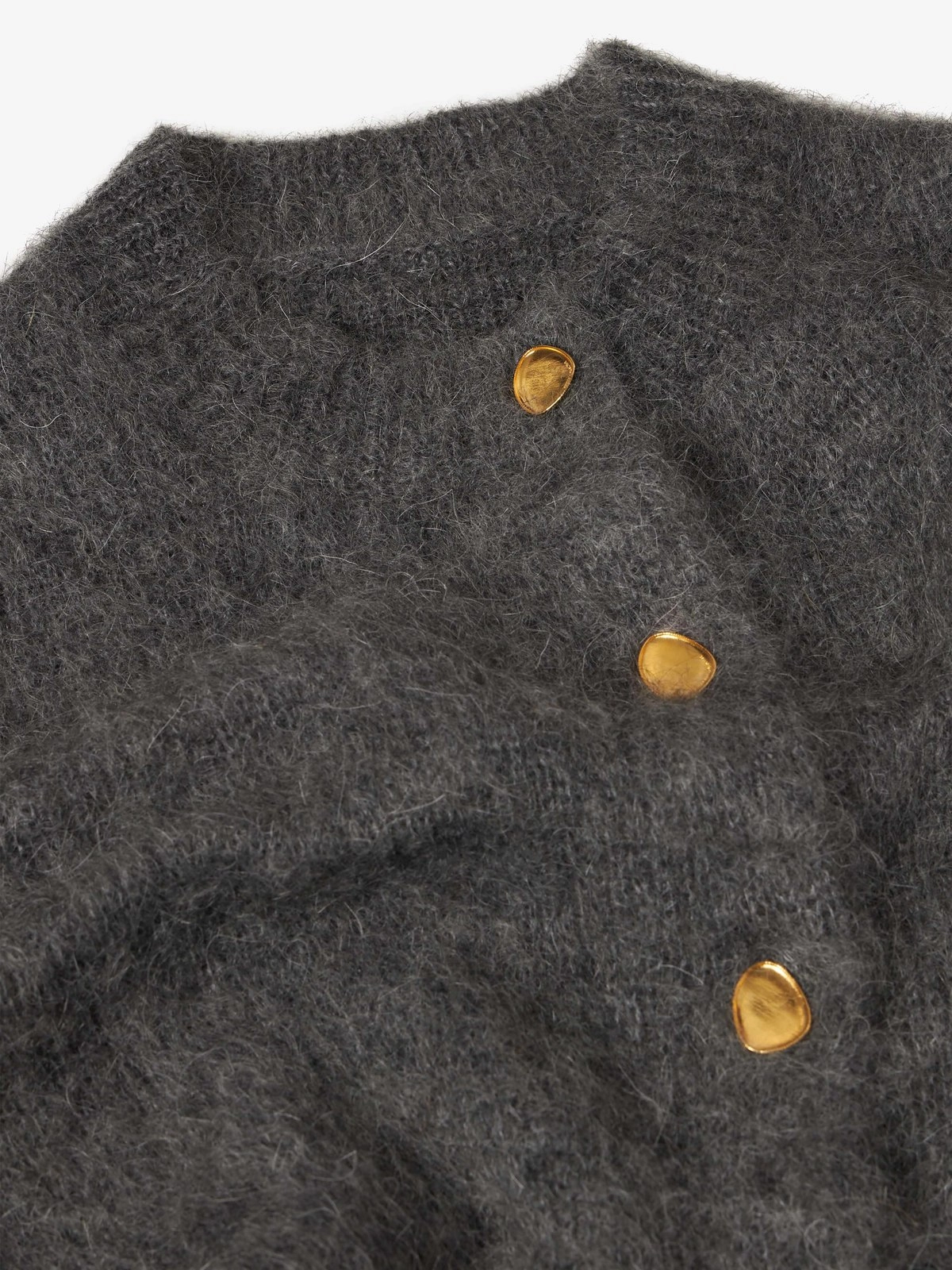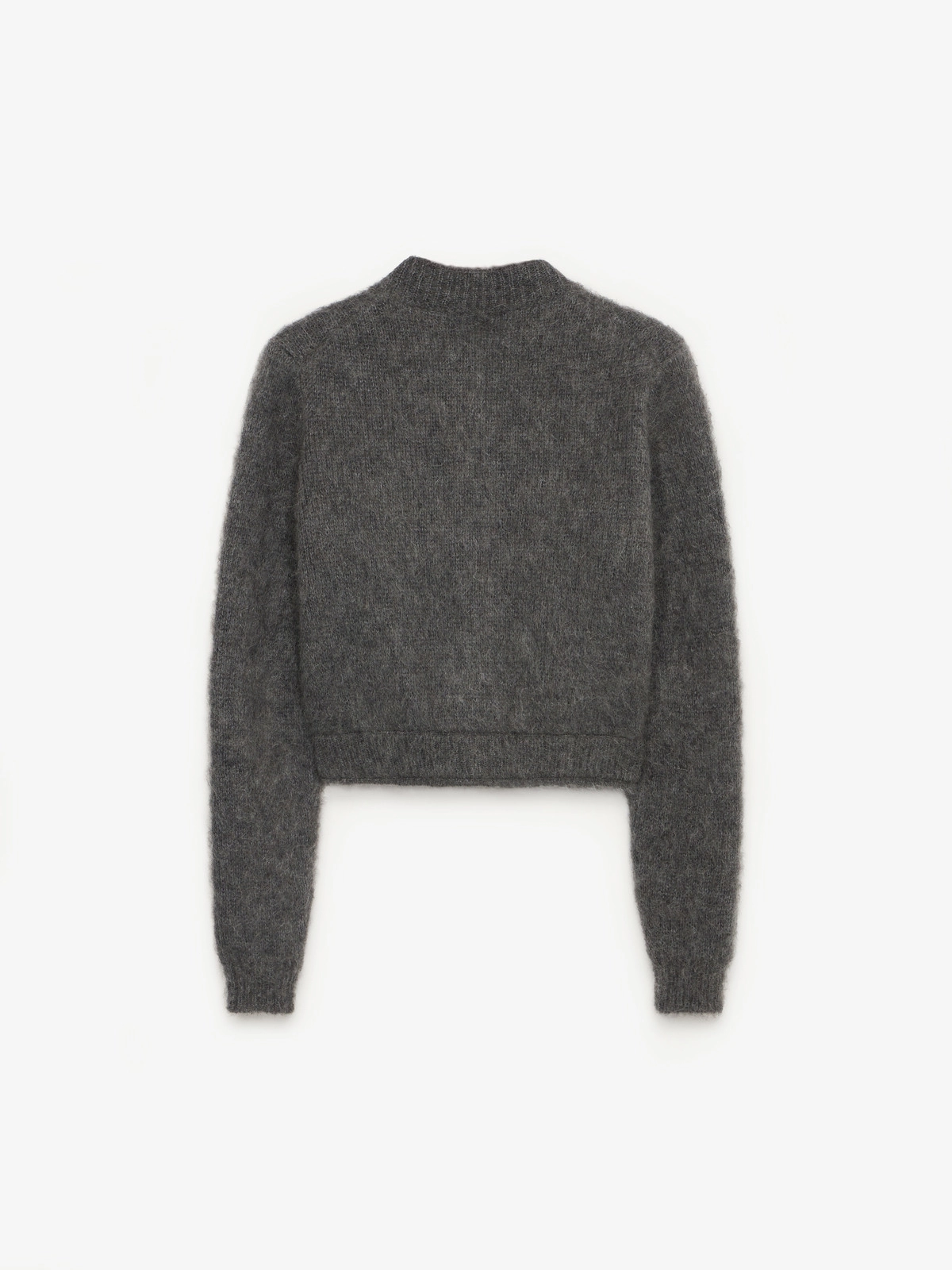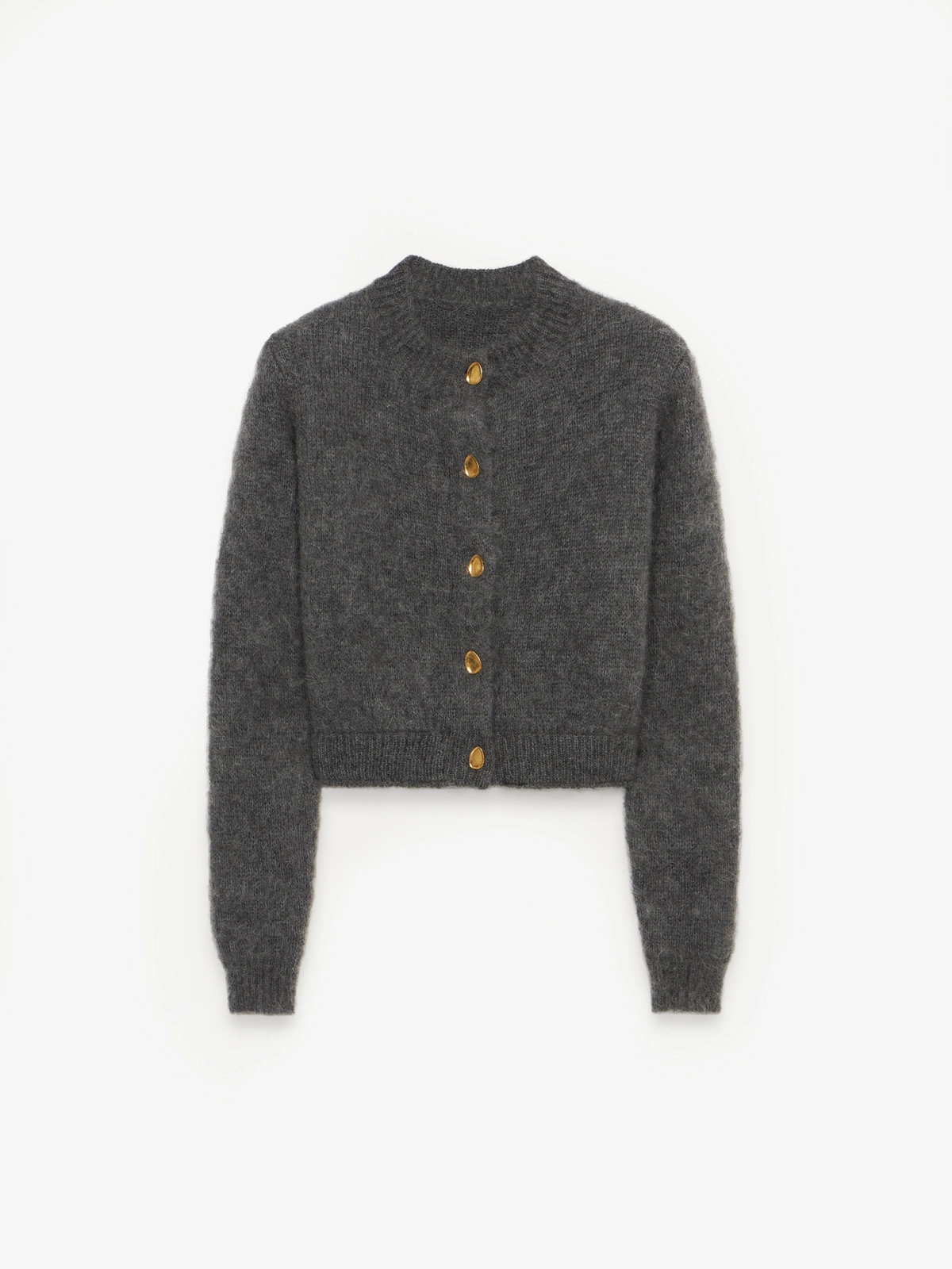 这款 cropped cardigan 短身针织开衫夹克,精选高品质马海毛材质,运用独特的 Brushed jacquard stitch technique 刷毛提花针法缝制,展现出细腻的纹理美感。金色珠宝钮扣上刻有品牌 ANEST 徽标,腰部内侧及内腰带上配有罗缎饰边,使款式具有夹克的感觉,彰显了意大利工艺的精湛与品质保证。