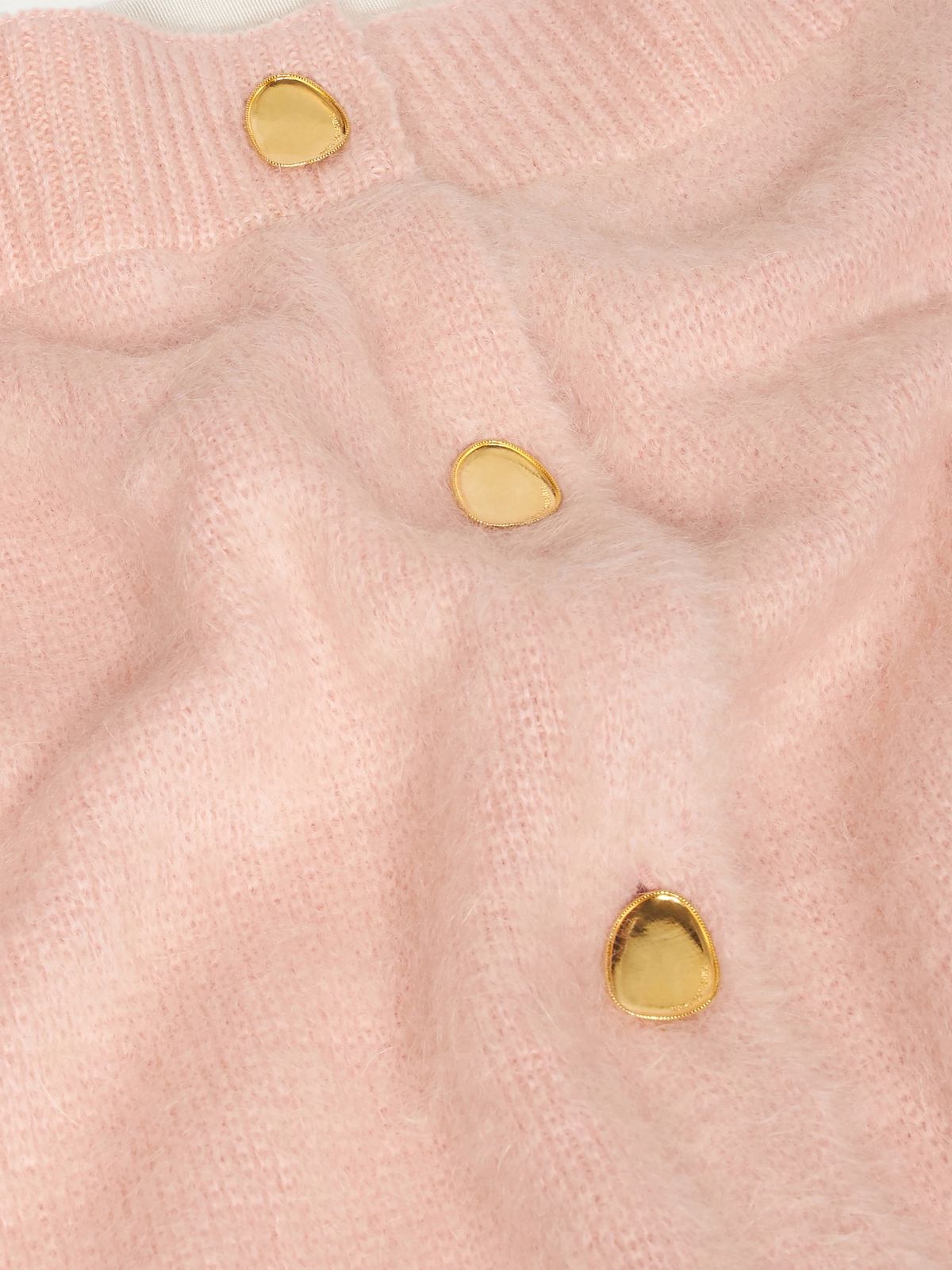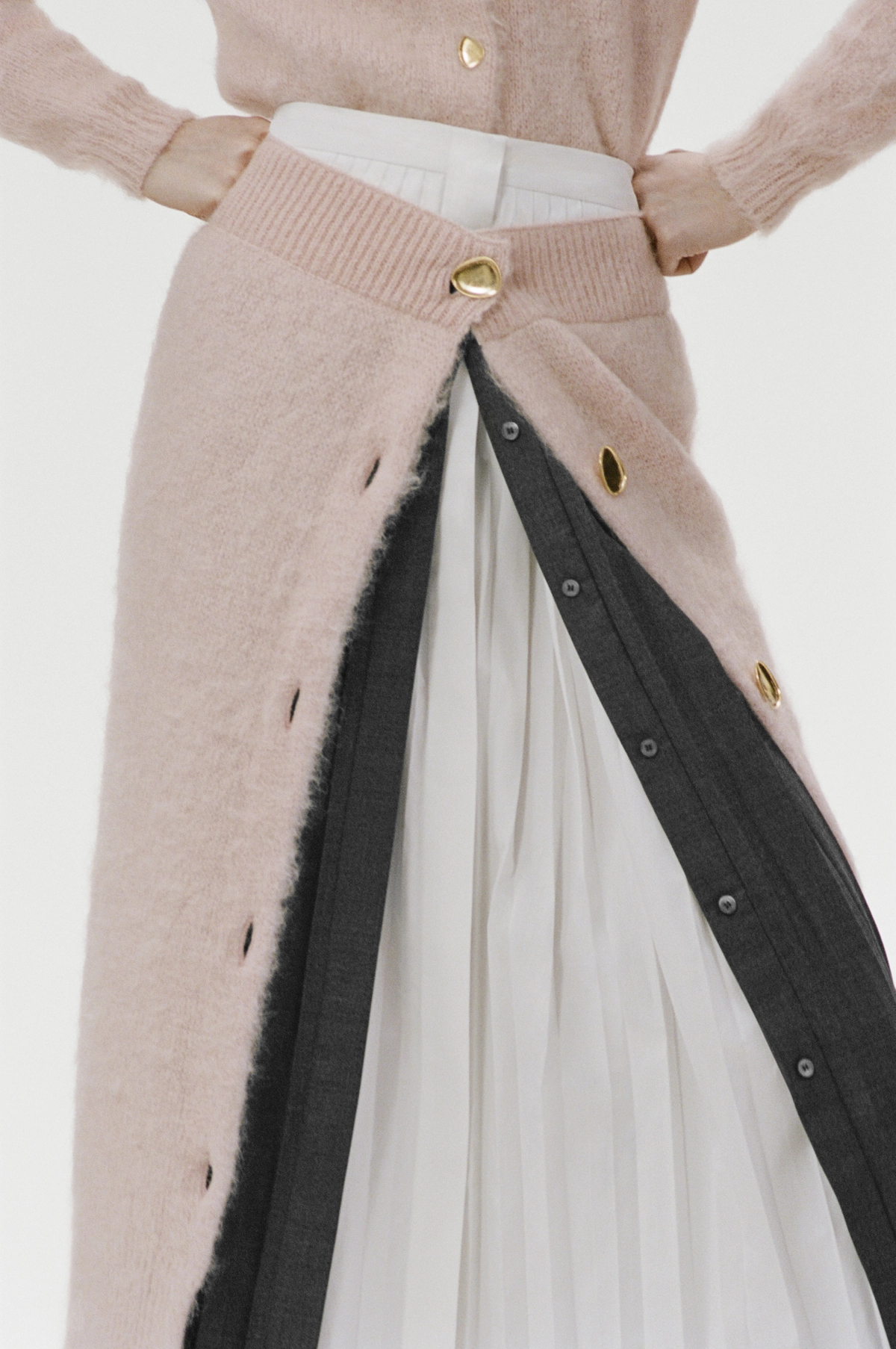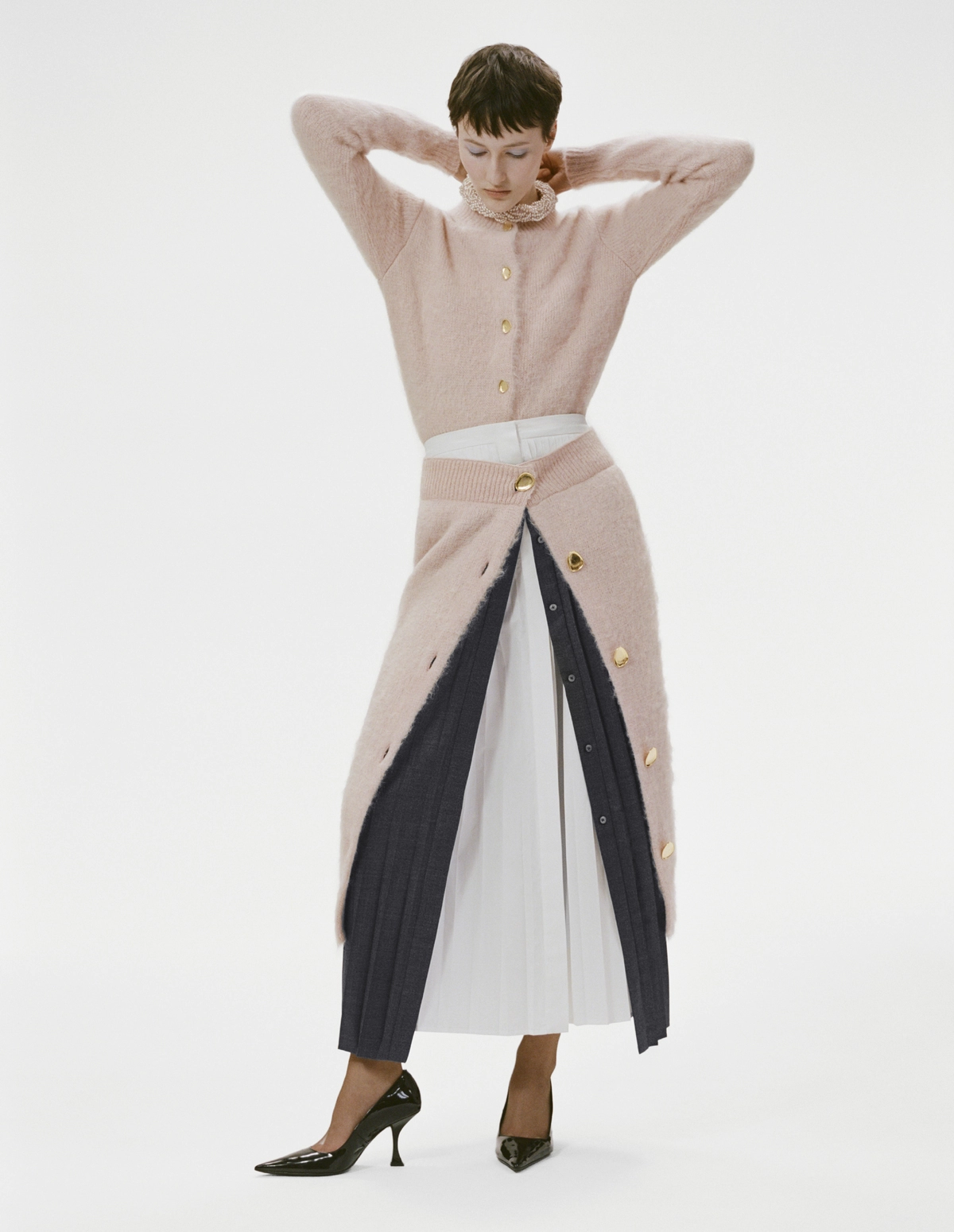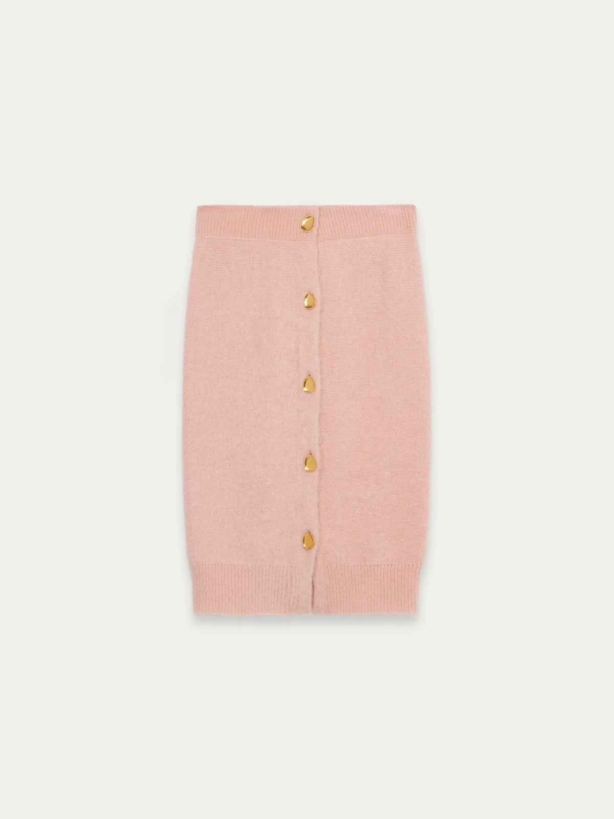这款马海羔羊毛铅笔裙采用与同款羊毛开衫相同的刷毛提花针法制作而成。裙身饰以金色珠宝钮扣,镌刻有 ANEST 徽标,腰部内侧配有罗缎饰边。这样的设计确保了它能与同系列的羊毛开衫夹克搭配得天衣无缝,彰显了精湛的意大利精湛工艺。